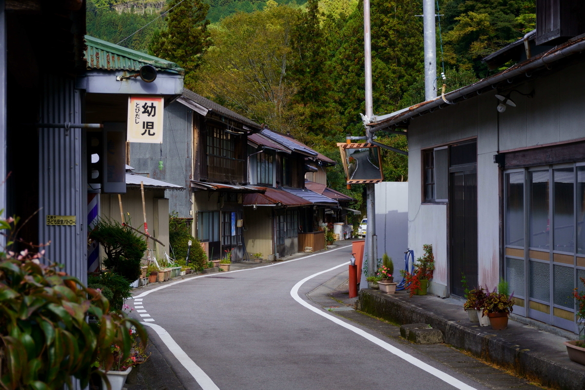 こういう景色を見るために登ったのだという気持ち。曲がった旧道の両脇に建物がある景色は良い。家の中から演歌が聞こえる。僕もこんなところで余生を過ごしてみたいが、高齢化と集落の行く末を感じる。
