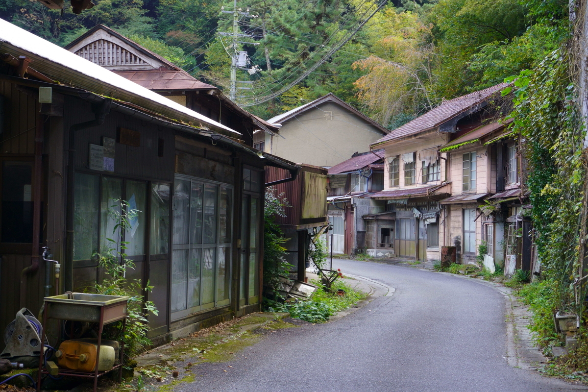 途中、四国でよく見る空き家だらけの集落があった。商店跡や旅館跡が並ぶ。移動速度が低かった時代は需要があったのだろう。