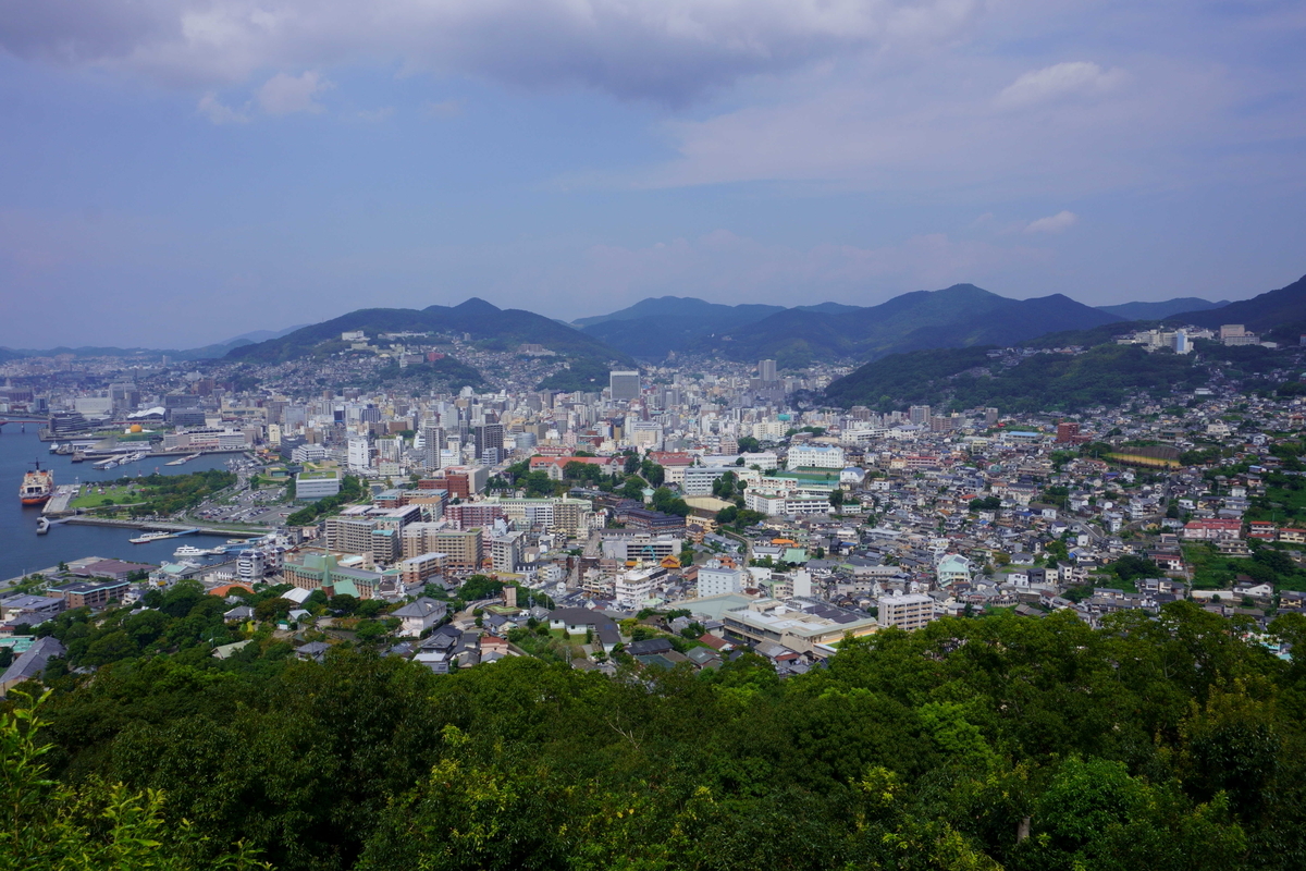 長崎の街を一望するため、鍋冠山公園に向かう。途中の山の尾根沿いにまで家がある道が印象的だった。鍋冠山公園からの景色は、長崎の都市部から住宅街へのグラデーションを感じられておもしろい。四国の鄙びた港町をめちゃくちゃ発展させたらこうなるのだろう。
