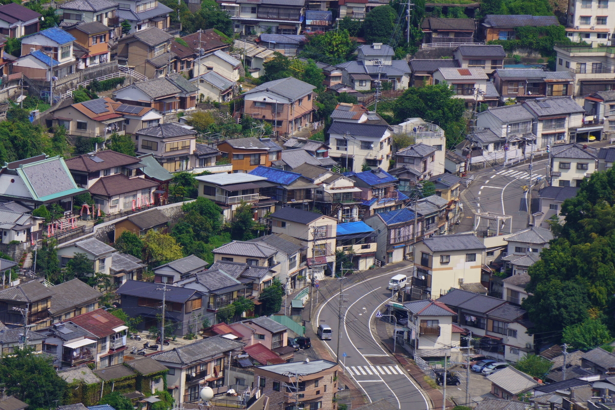 大浦展望台に着く。目の前の斜面に住宅地が広がる。一軒家やマンション、お店、学校が所狭しと並んでいるのがたまらない。新幹線の車窓を眺めているときの気分になる。