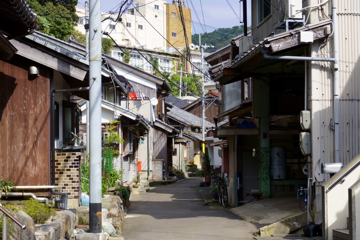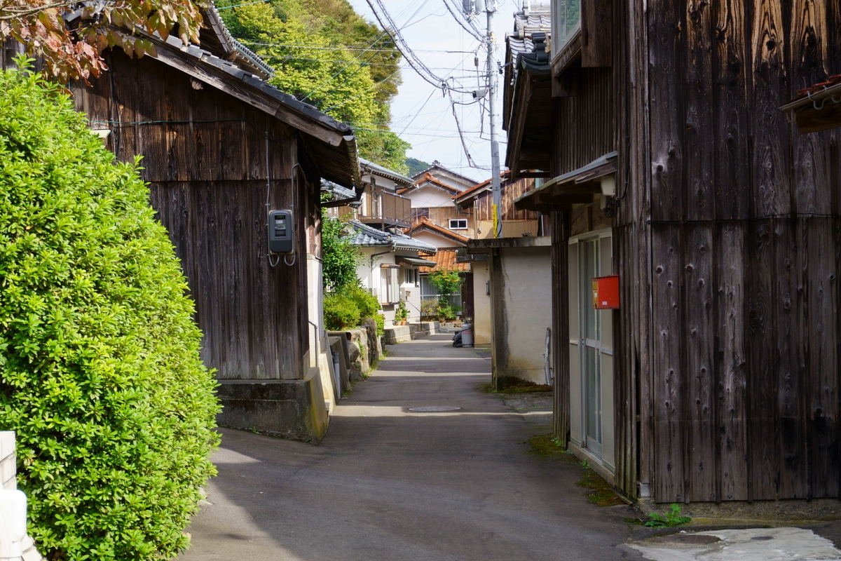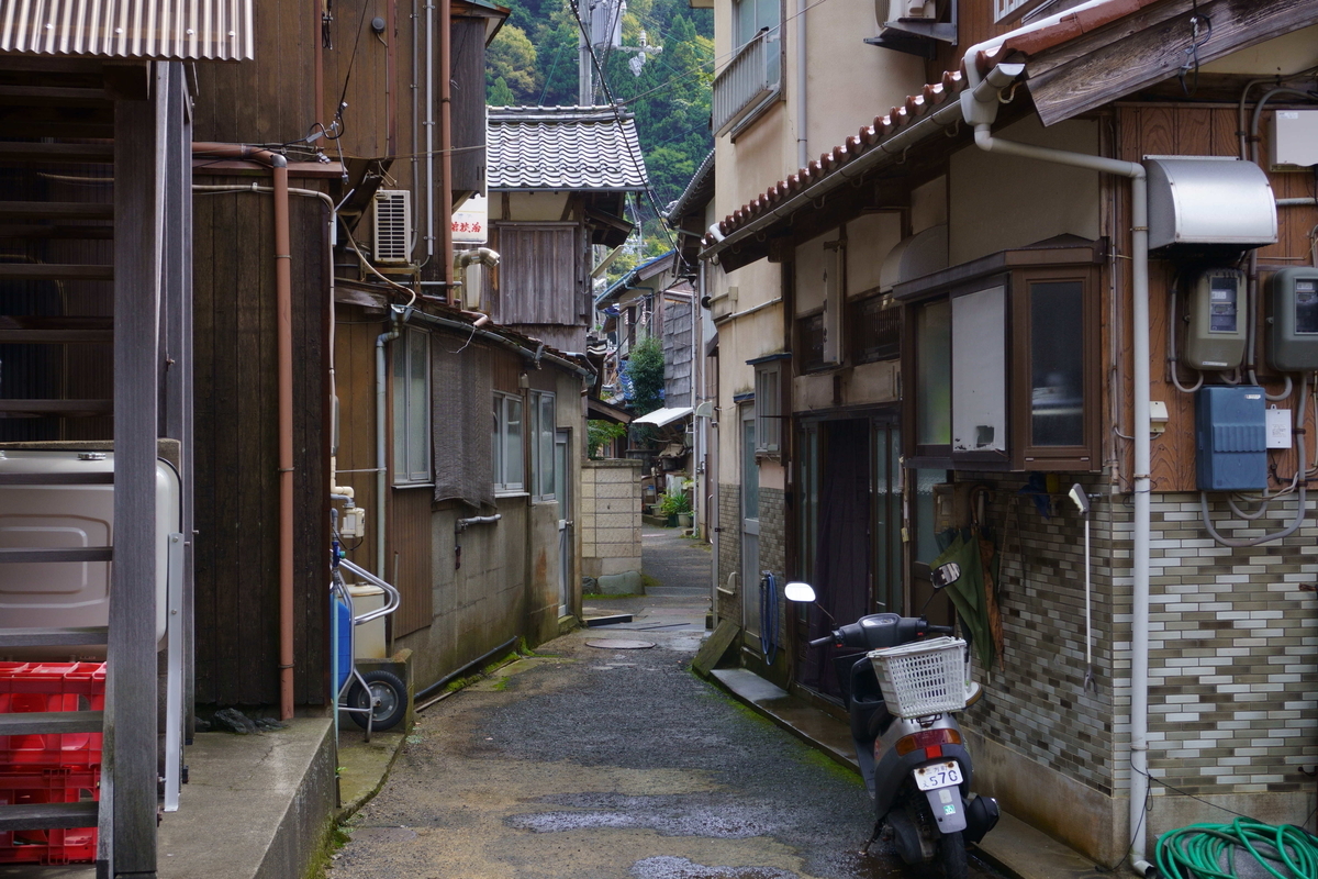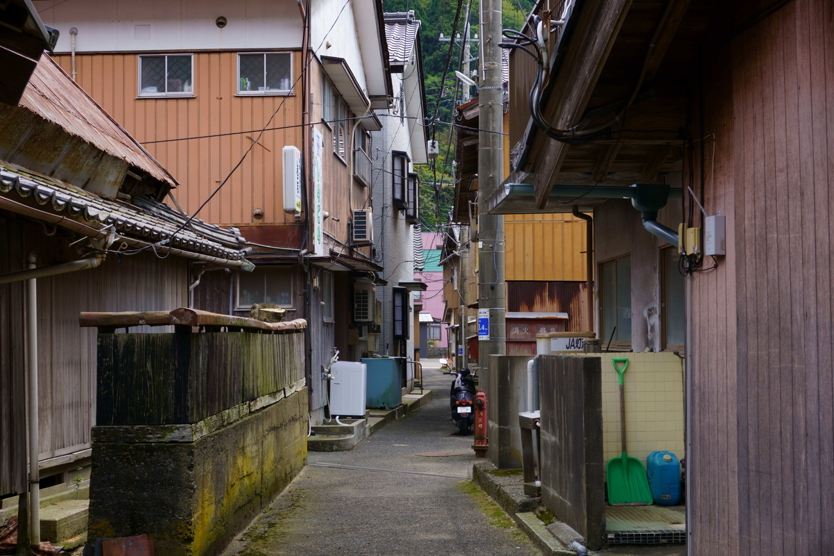 小川漁港の裏道。細い路地の両脇に家が立ち並ぶ。