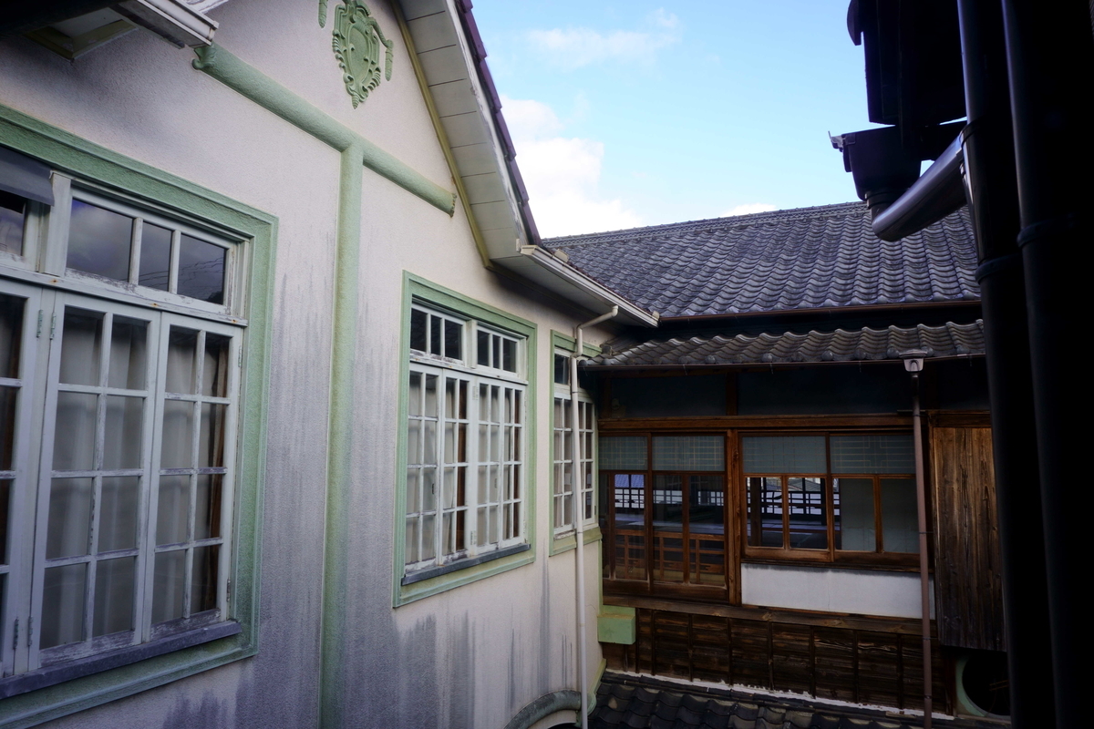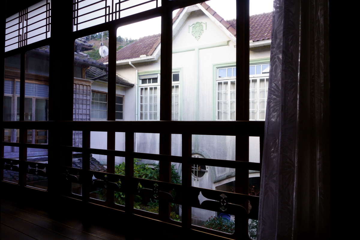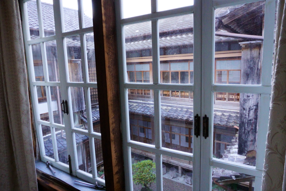 現在、ダンスホールの中は客室になっている。洋風の窓枠から旅館の向こうが見える。