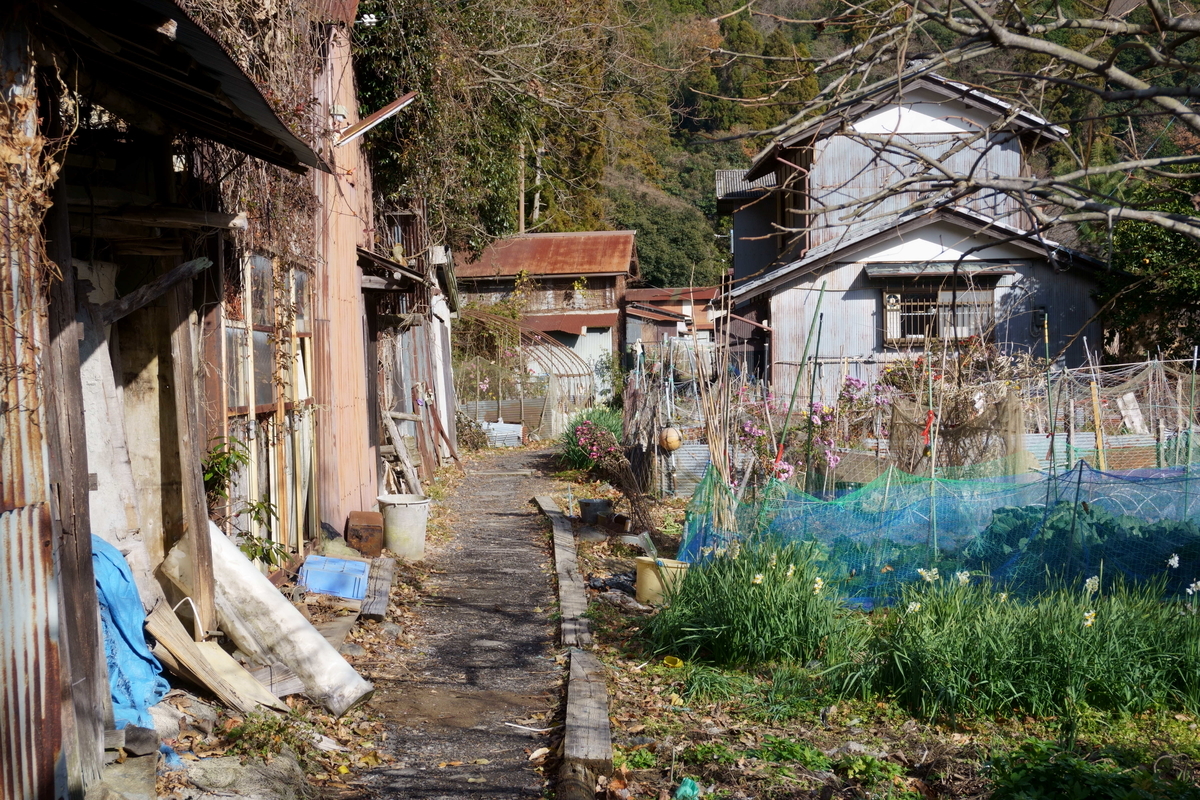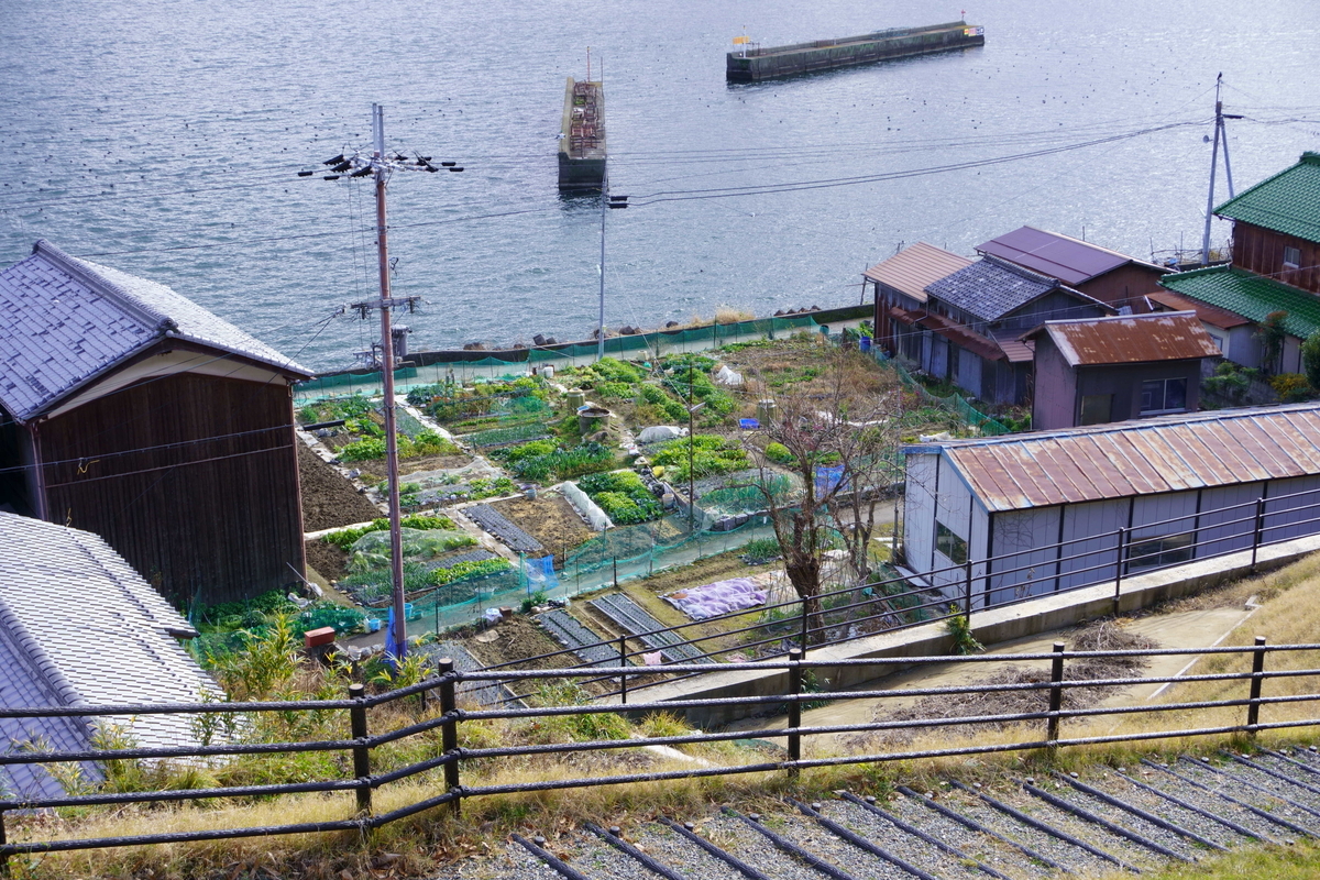 小学校を抜け、更に東側へと向かう。ここは空き家と畑が多いエリアだ。畑はよく整備されている。動物の被害を減らすためか、防犯ブザーや電気柵が設置されている。奥には厳島神社があるが、時間の関係で今回は途中で引き返した。歩く僕らを島民の方が三輪車で追い抜かしていく。