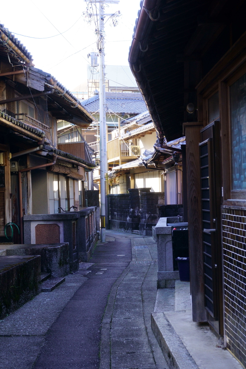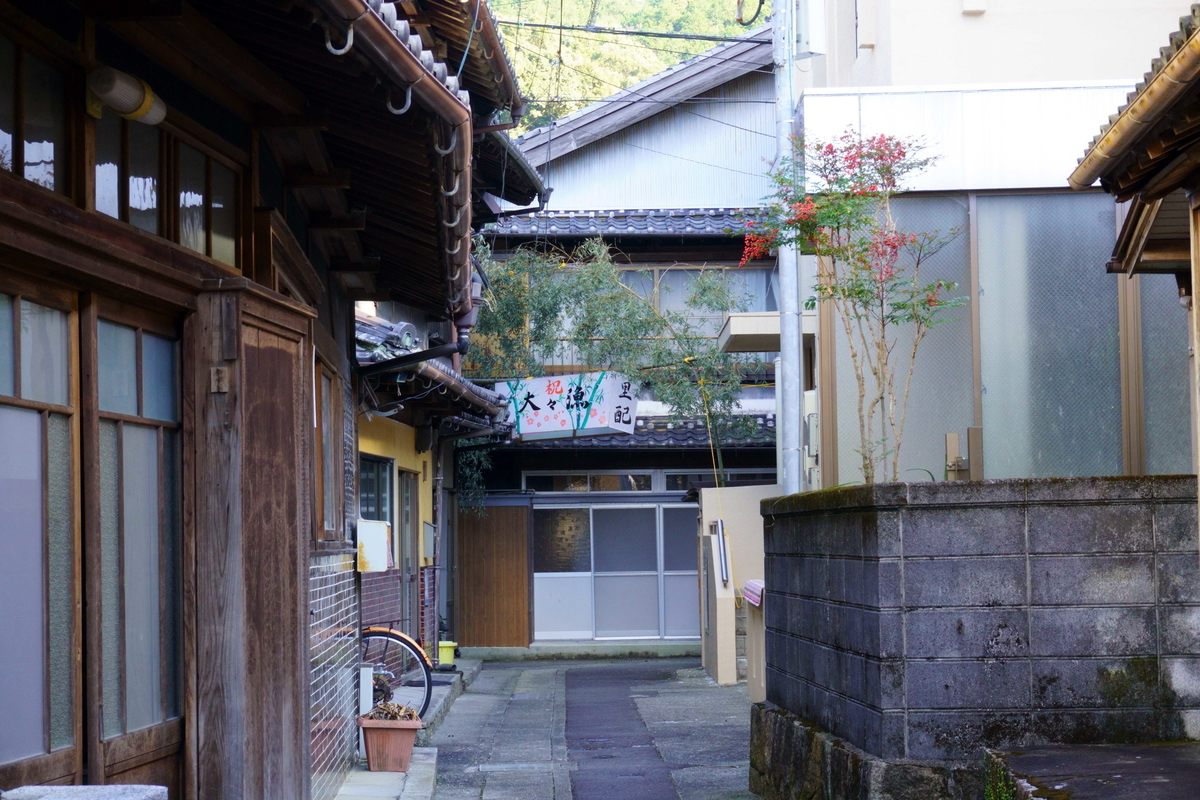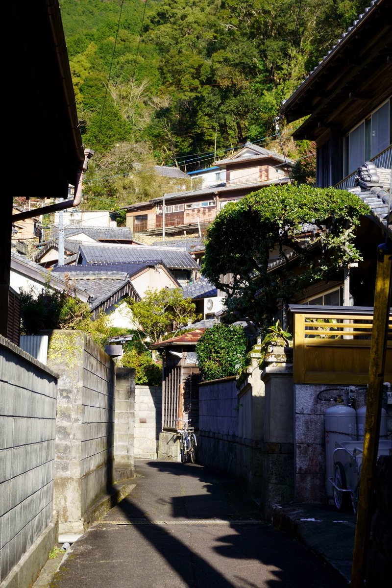 九鬼港の路地はとても狭く曲がりくねっている。すぐに自分がどの方角を向いているのかわからなくなる。たまに目立つ看板があるとそこを目印にすることになる。