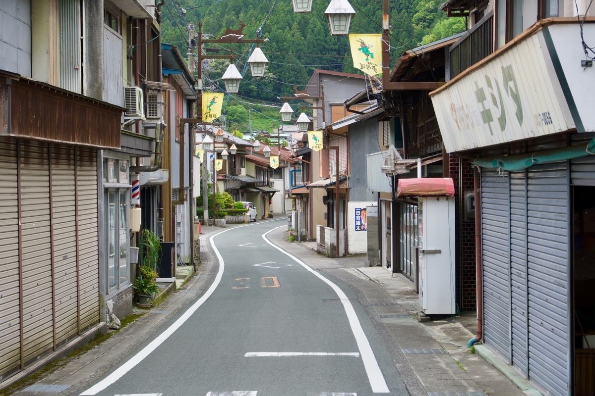 秋葉街道沿いの水窪商店街。今では多くの店が閉じられているが、ところどころ開いているお店もあり、食料品店を訪問した。