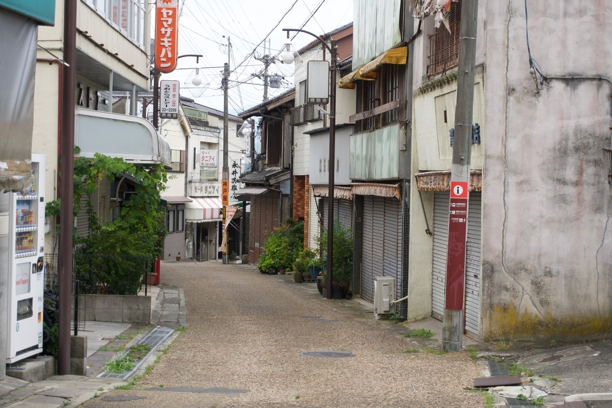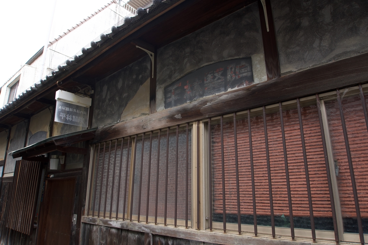 旧道沿いには個人商店や病院跡が残っていた。このような街にはよく結婚式衣装の貸出を行っていた店がある。