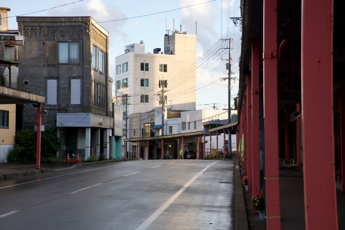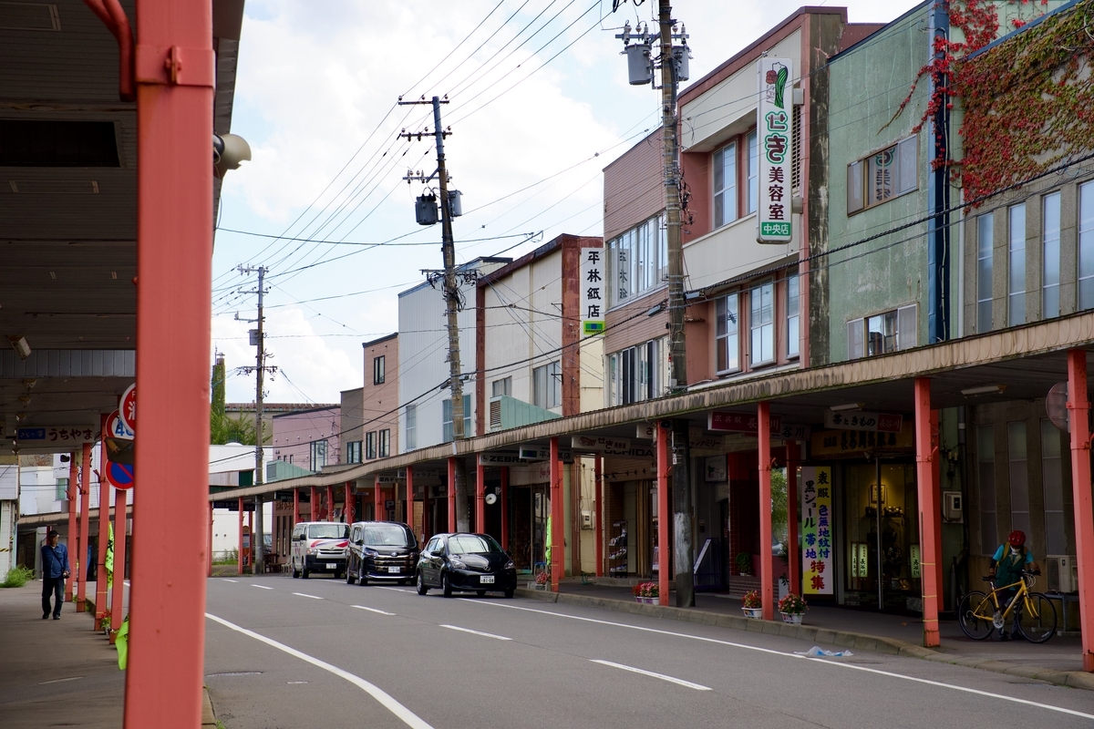 商店街は南北に若干の高低差があり、南側の山に向かうほど徐々に高くなる。南側には太めの通りが走っており、雪国にありがちな屋根付きの商店街となっている。ここもシャッターが閉まった店が多い。