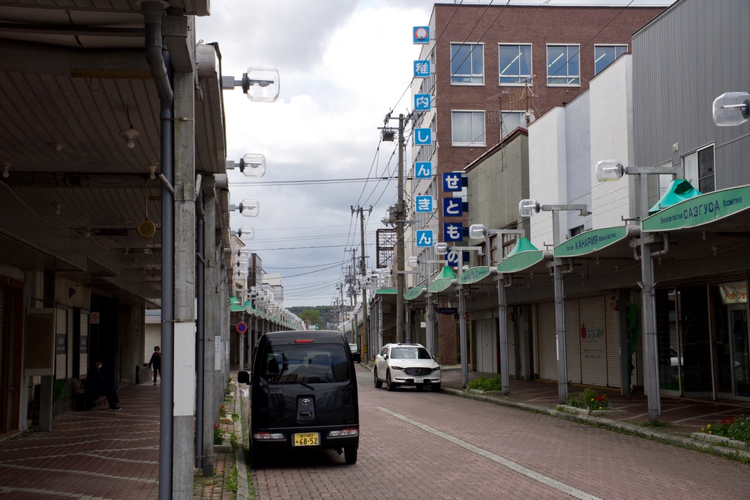 駅を出るとすぐに商店街があります。ロシア語表記もあり、樺太への近さを感じさせます。