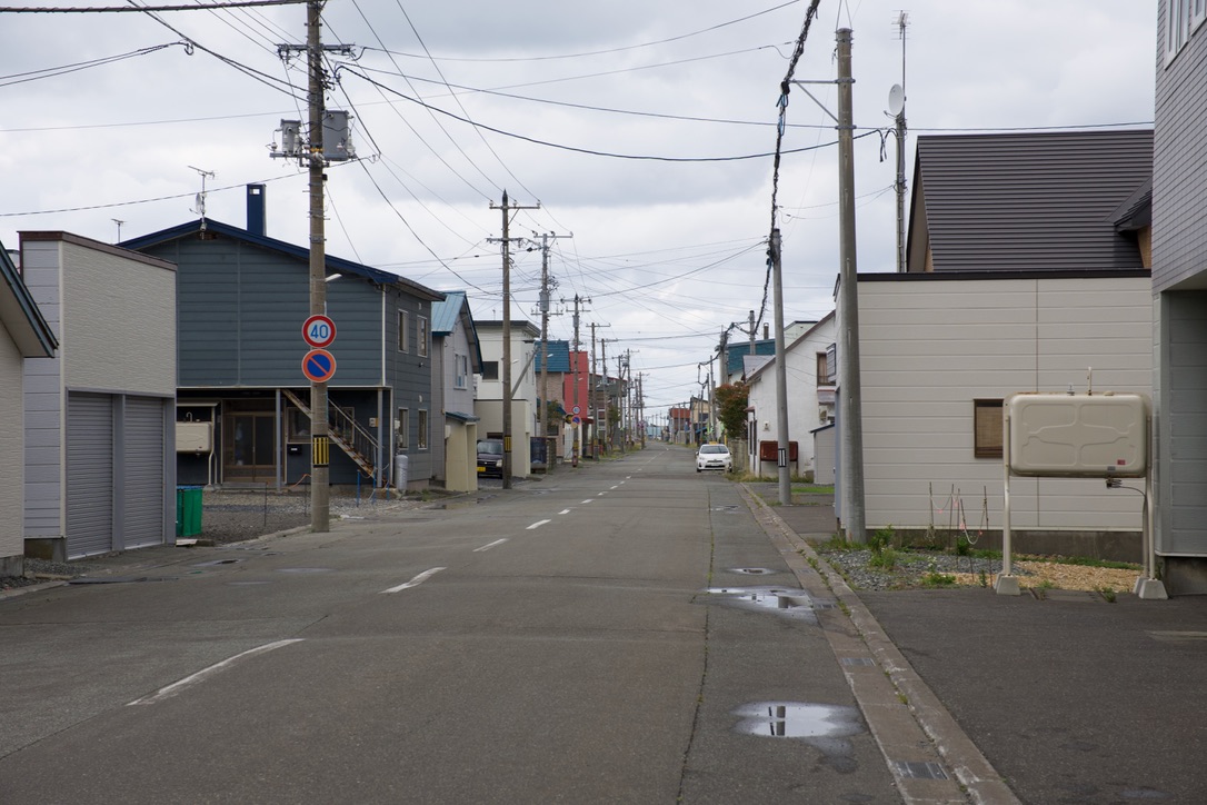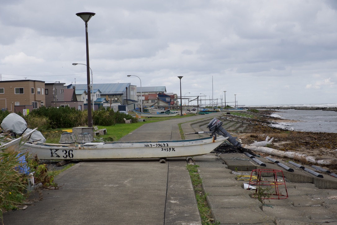 駅前の商店街を抜けると、住宅地になります。すぐ近くにはオホーツク海があり、船が置かれていました。