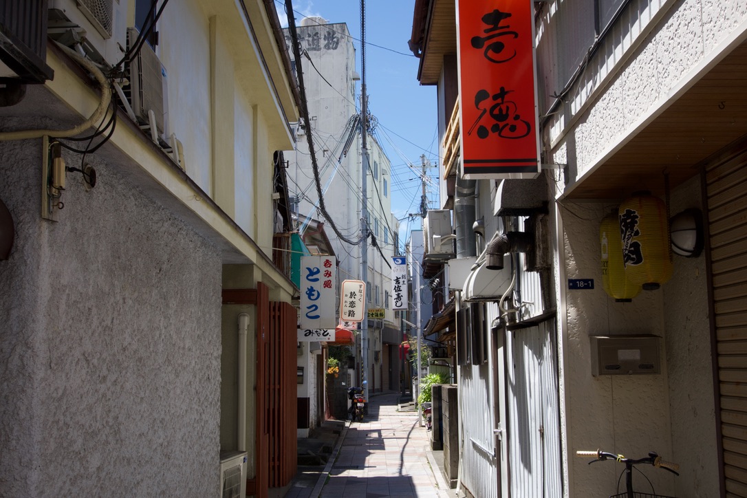 細い曲がりくねった路地の両側には居酒屋や料亭、スナックが並びます。