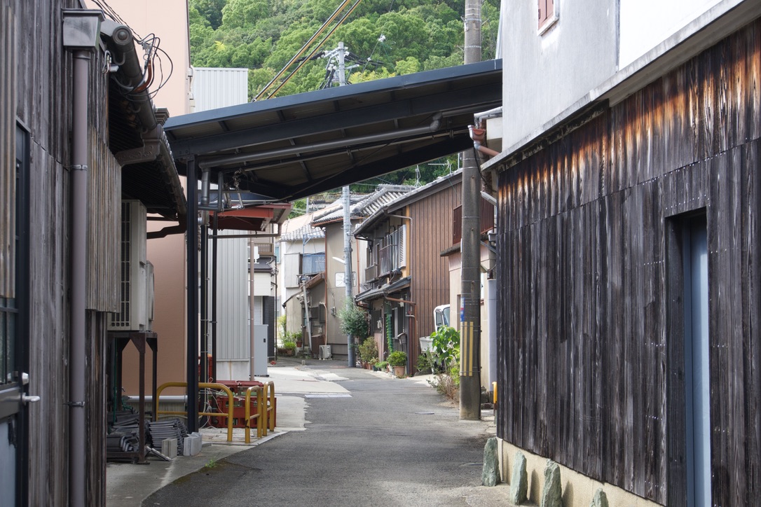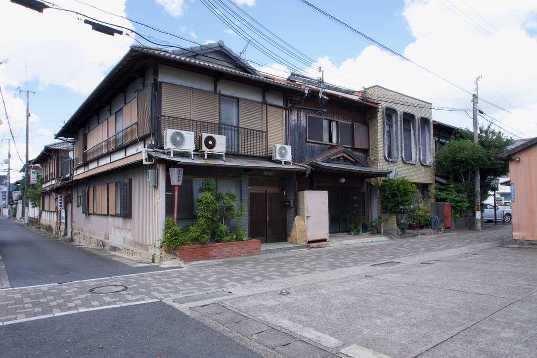 商店街を歩いて向かった先は花街跡(遊郭跡?)の田辺新地です。よく見ると凝ったデザインの料亭跡がありました。