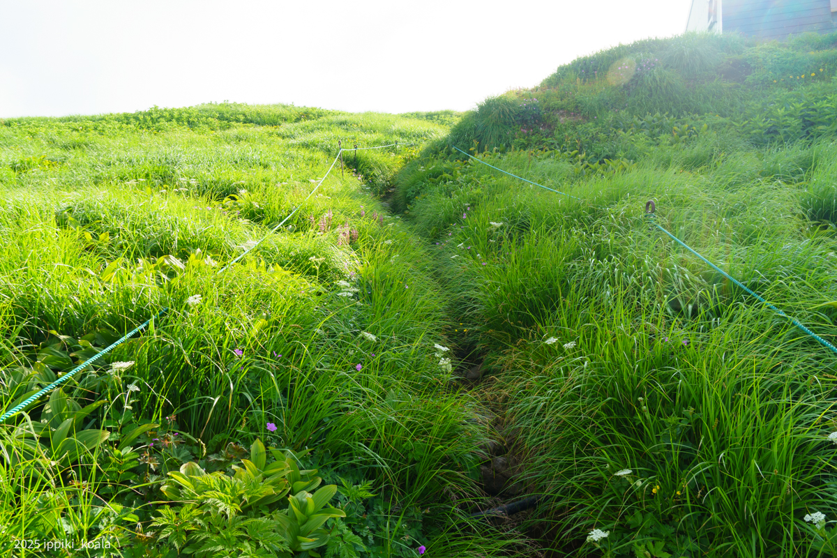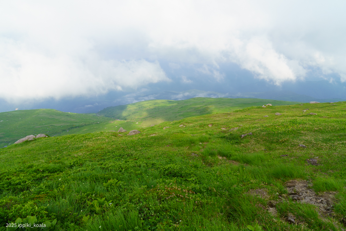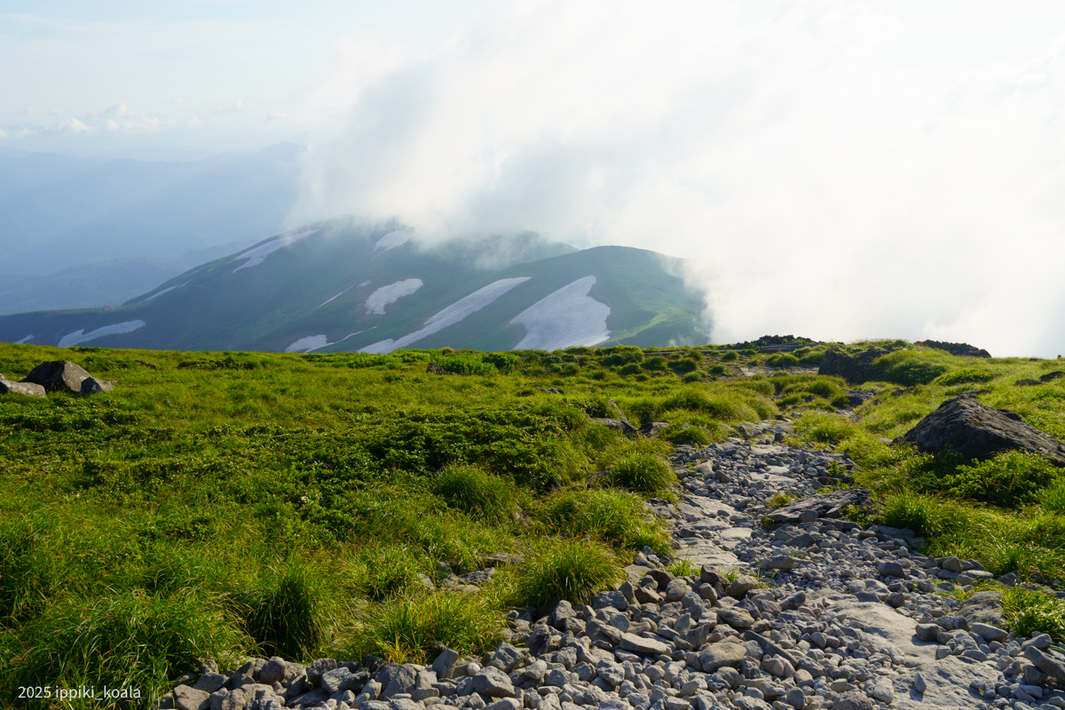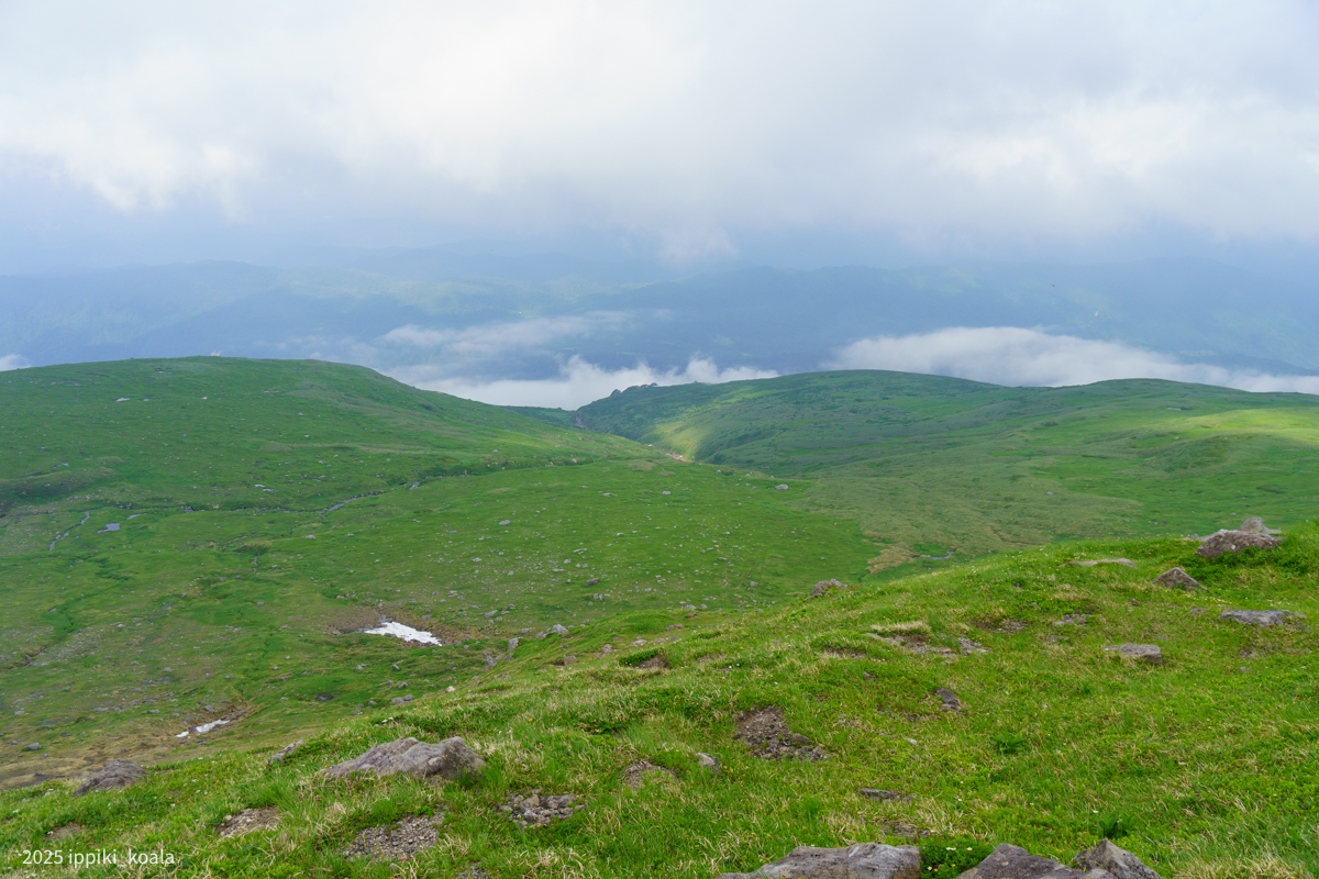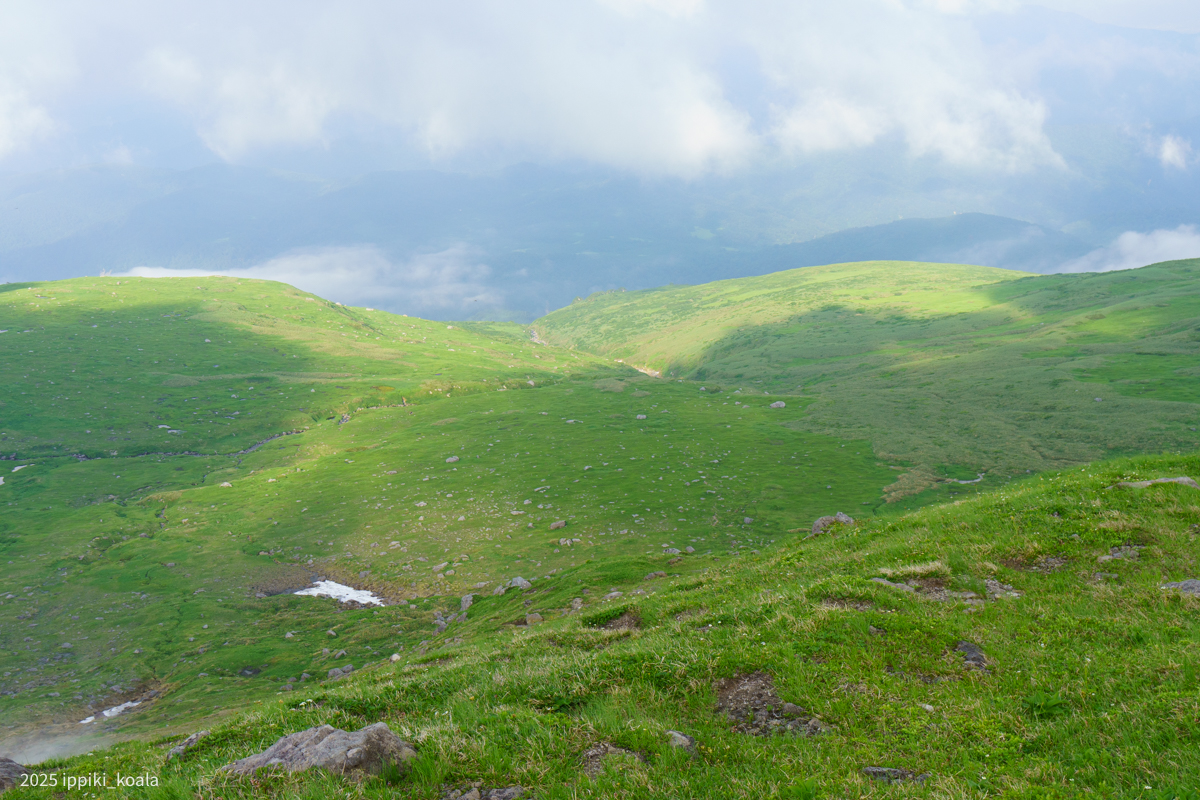 まず肘折方面へ。ここから肘折温泉に降りるルートがあるんですね。高山植物がたくさん咲いていて、ミツバチととんぼが飛び回っている。とてもきれいでした。
