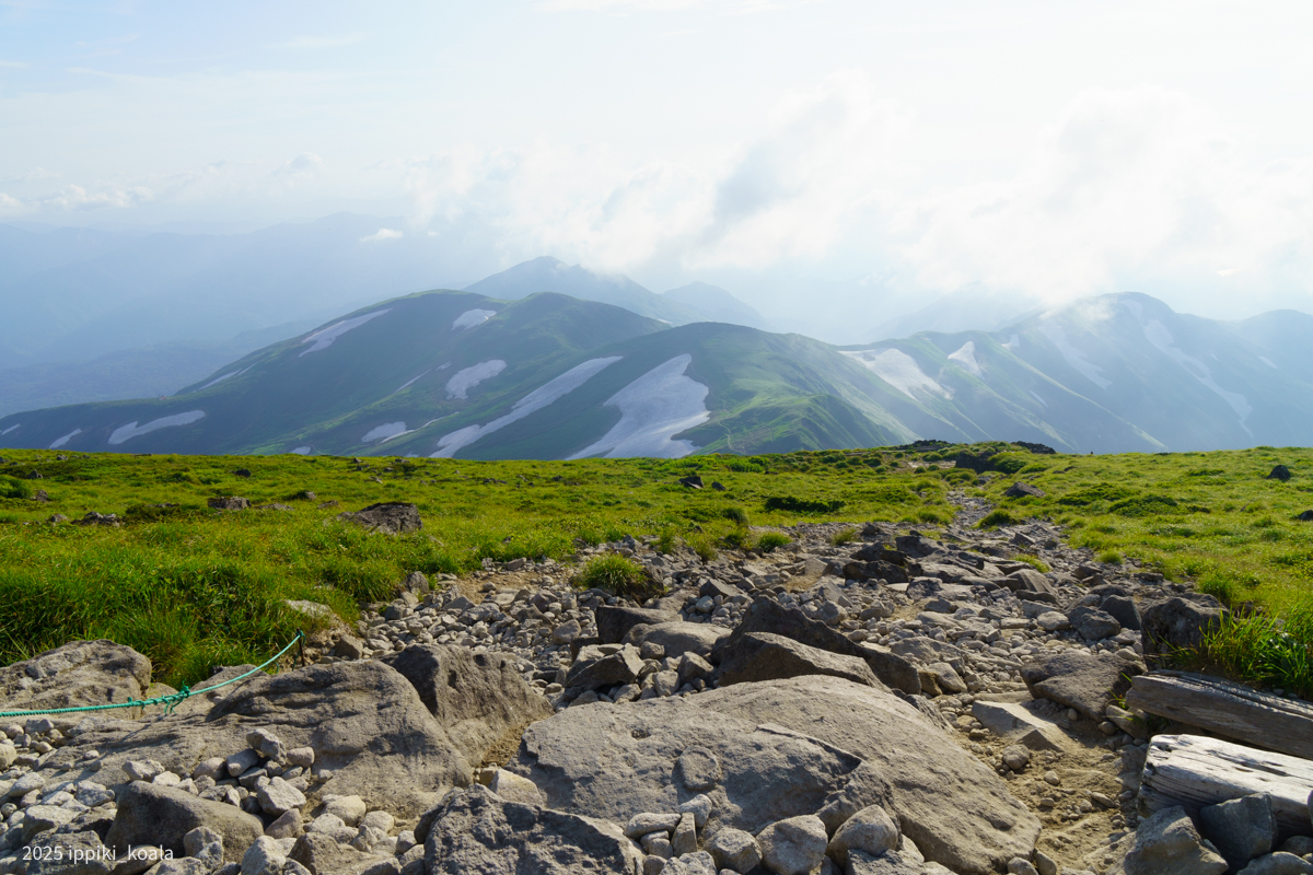 次に牛首方面へ。山頂まで登ってきた道を少し戻ってみます。ここも尾根が見渡せてとてもきれいでした。晴れていたら登るのも楽しかったのかもです。行きは何も見えなかったですが。