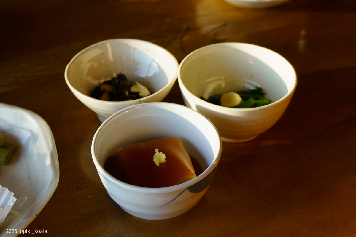 18時から夕食でした。夕食は合宿みたいに食堂でみんなで食べるスタイル。長机に自由に座るので、醤油などの調味料や漬物は隣の人たちとシェアするスタイルでした。