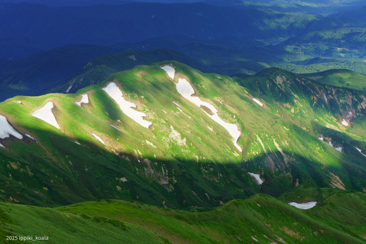朝ごはんを食べ終えて、肘折方面を眺めに行きました。東側なので朝日に照らされています。