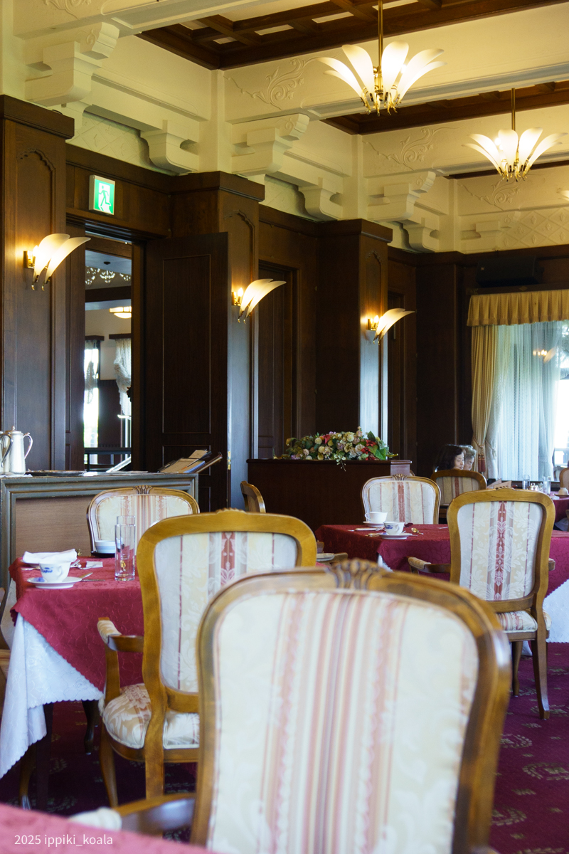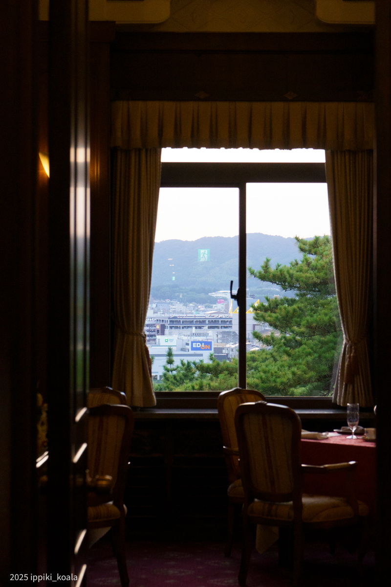 外に人がいないタイミングがあったのでロビーの写真を撮りました。いつでも2Fに行ける宿泊のメリットですね。クラシックな建物と外の景色の組み合わせがとてもよい。