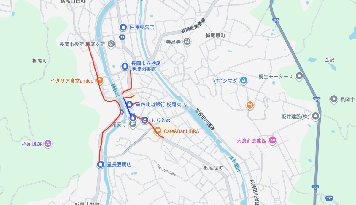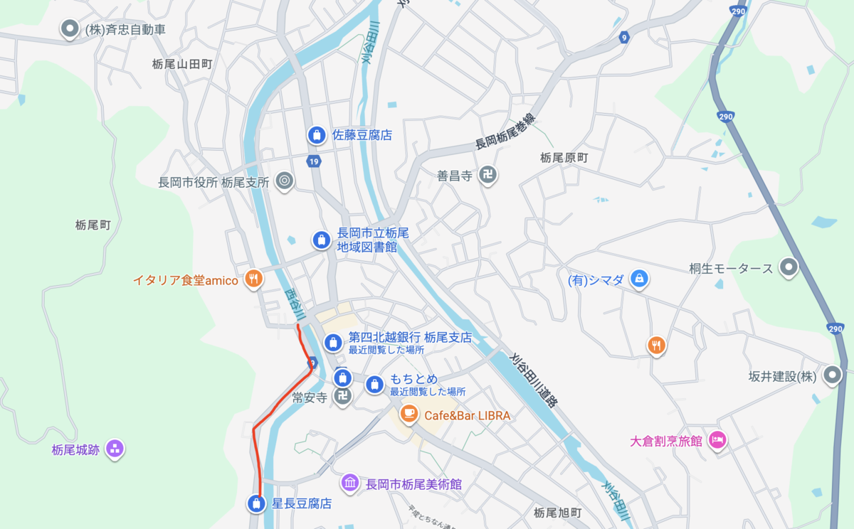 更に地図上の左の赤線の道を星長豆腐店がある辺りまで歩きました。