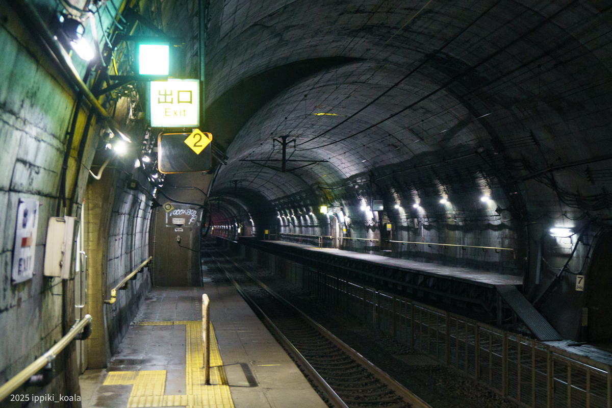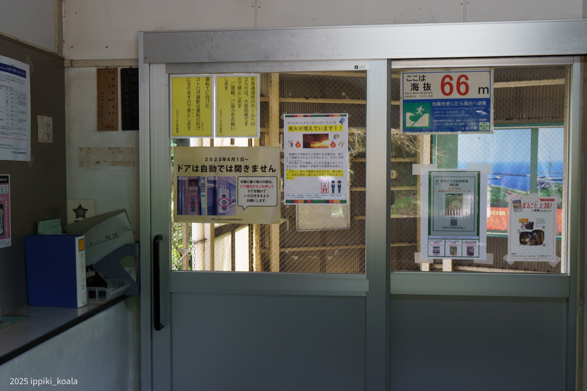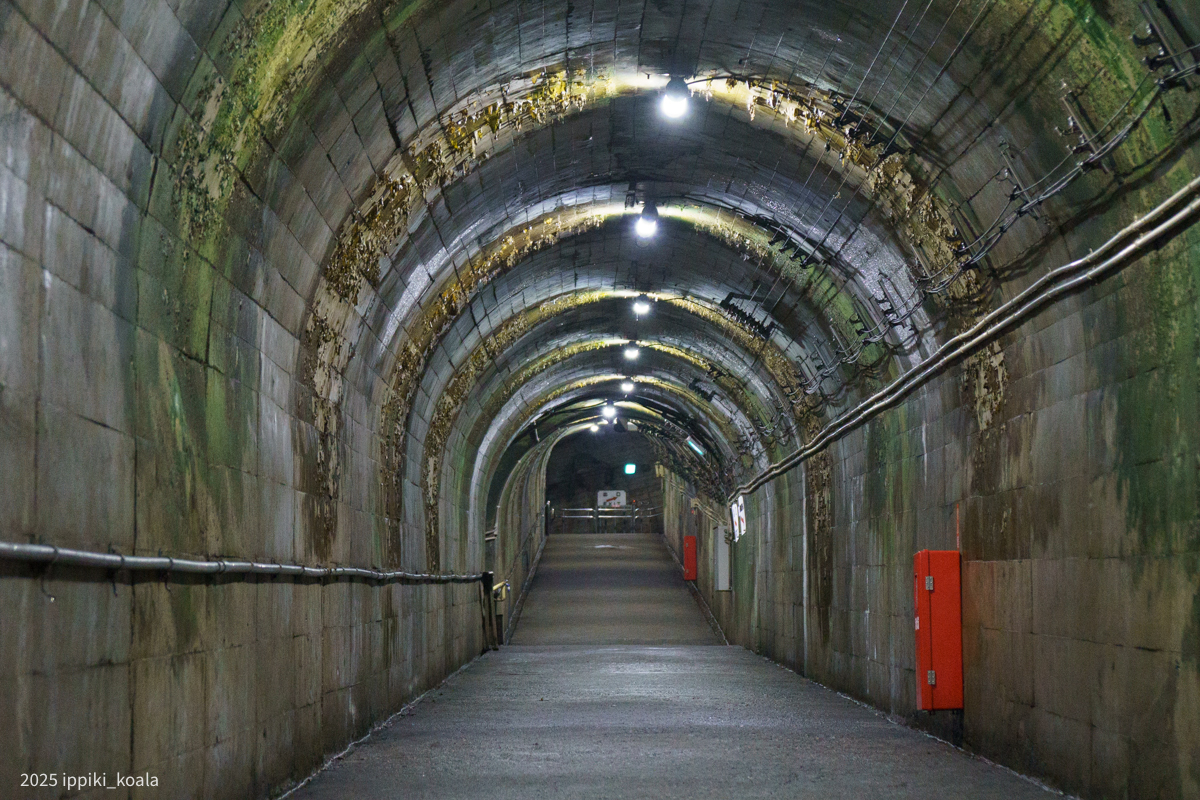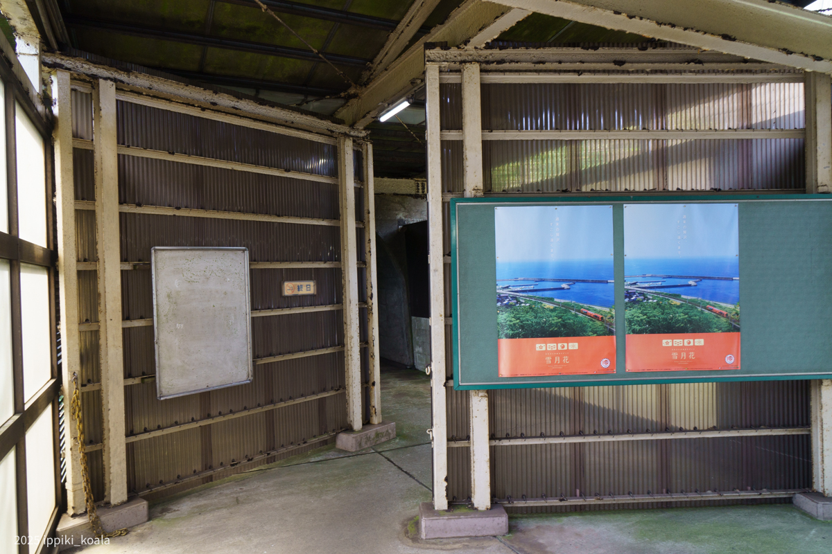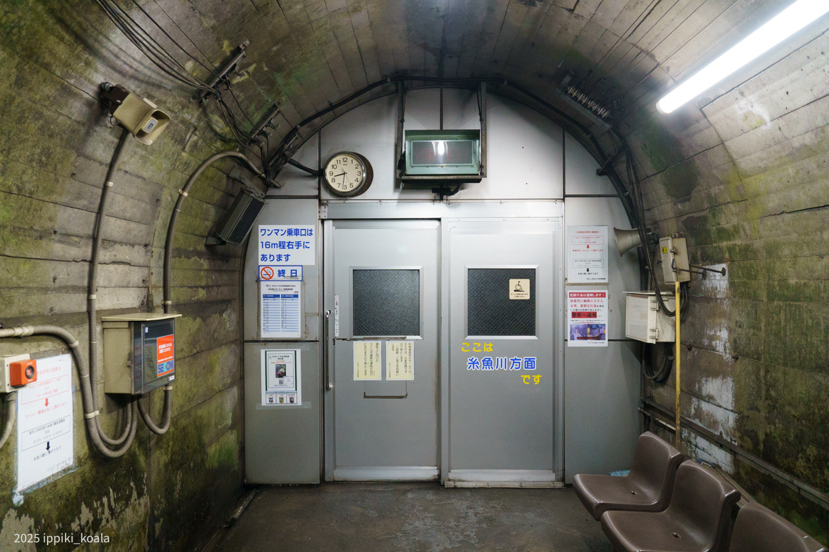 ひんやりしていて水の音が響いておりすぐ出たい気分に。トンネルと待合室の間にはドアがあり、列車通過時の風が吹き込まないようになっています。