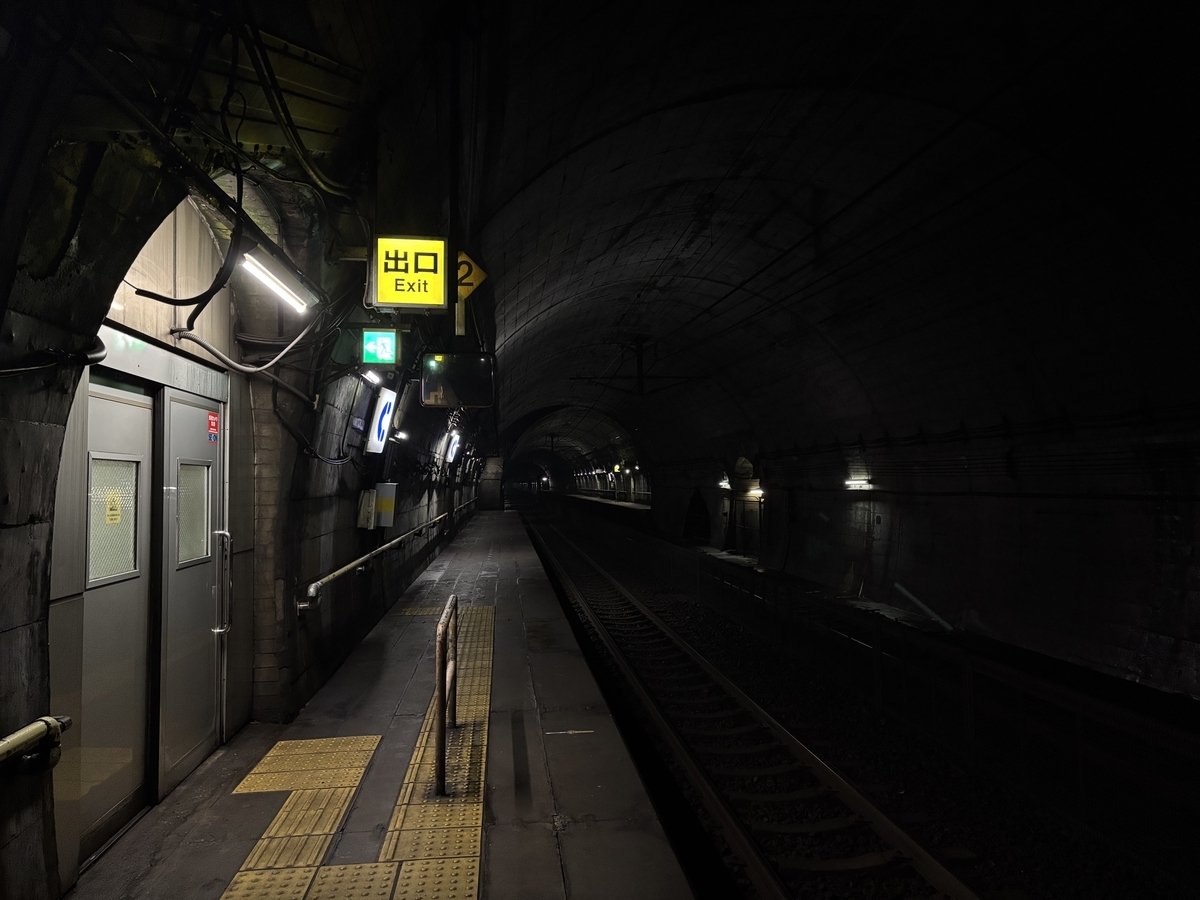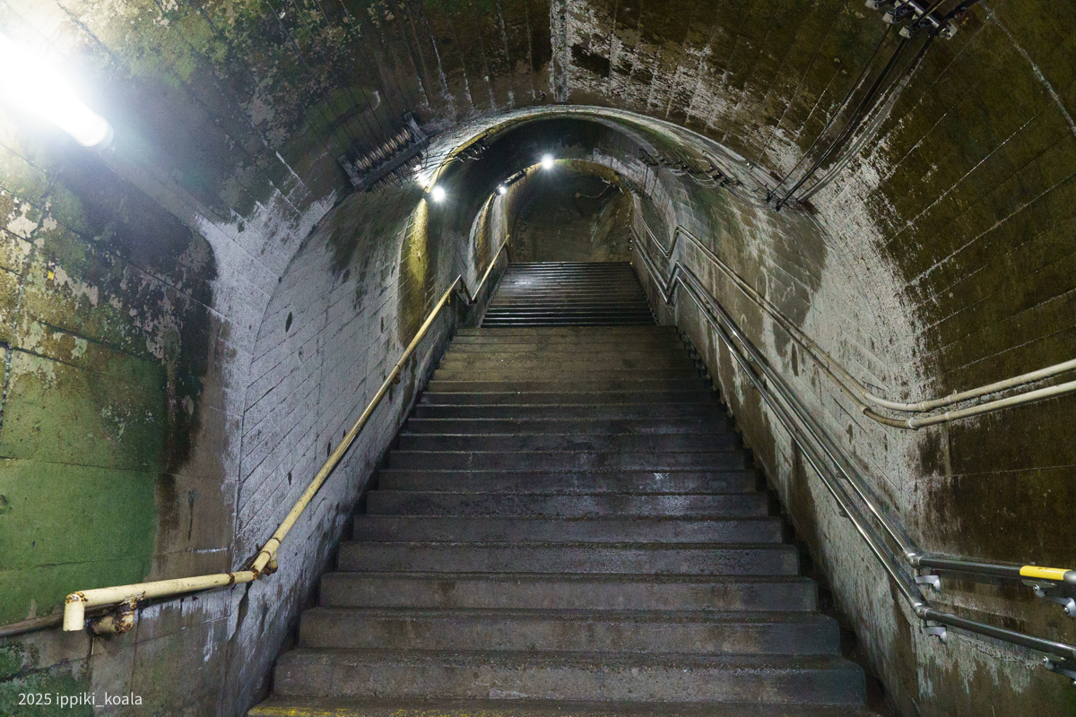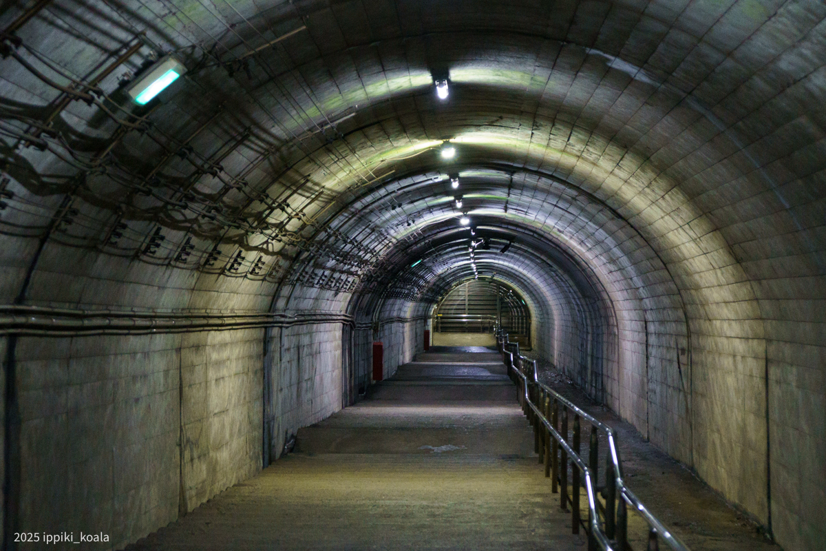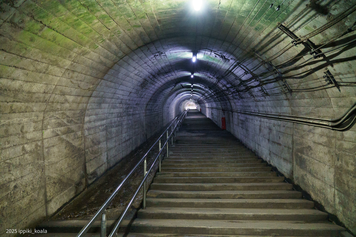 ひんやりしていて水の音が響いておりすぐ出たい気分に。トンネルと待合室の間にはドアがあり、列車通過時の風が吹き込まないようになっています。