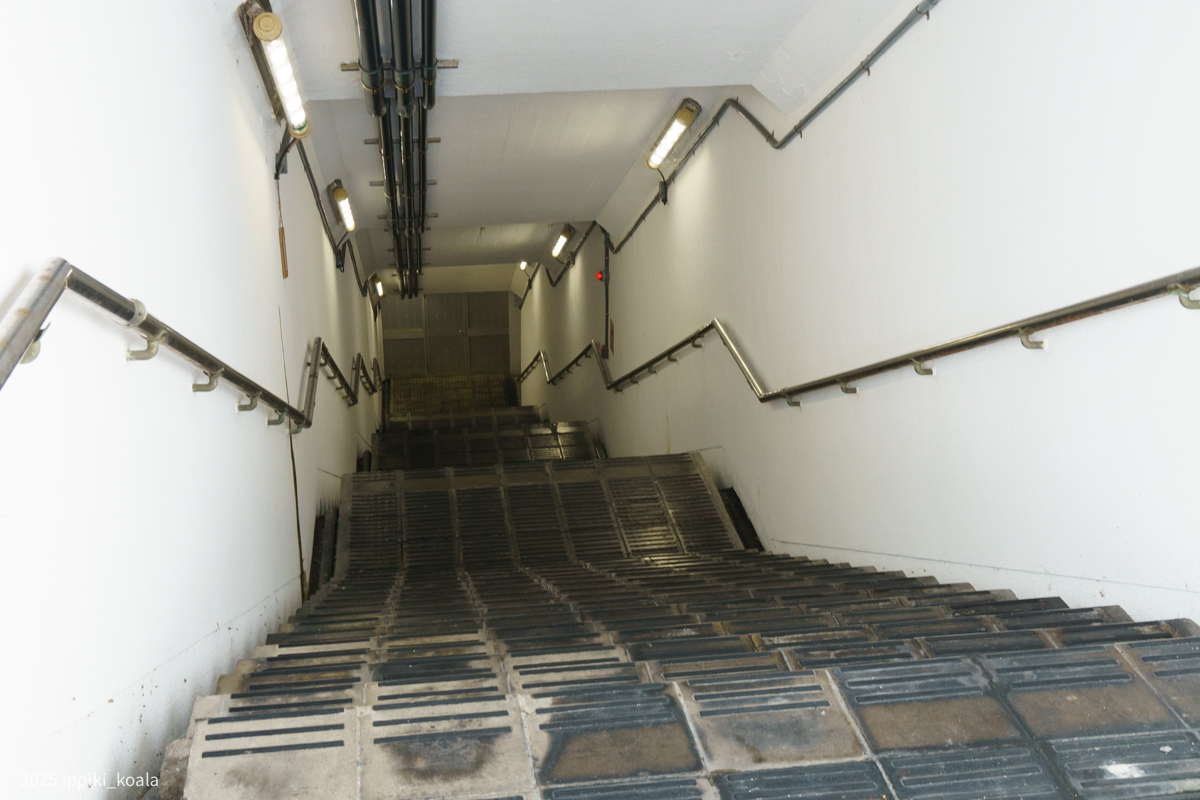 地下道をわたることに。海底かつ歩行者専用の地下道というのは日本で唯一らしい。どうしても行きたい僕は、熊が怖いという謎理論を振り回す妻を引き摺り地下道へ。熊がたらとっくに通報されているはずなので