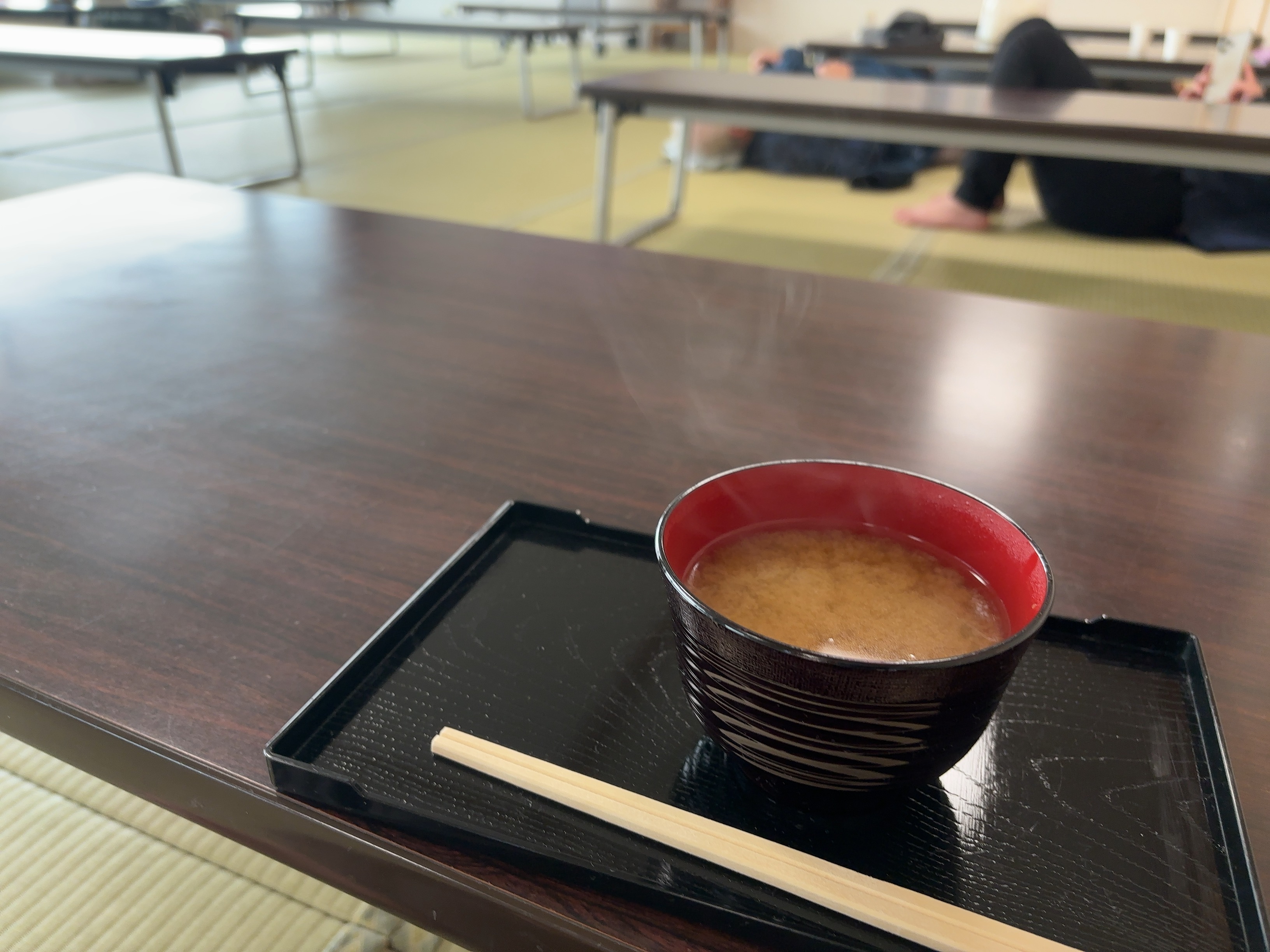 1Fがお土産売り場、エレベータで行った4Fが温泉になっています。 海辺の温泉に多い印象のナトリウム-塩化物強塩泉なのですが、若干ゴム?石油?っぽい匂いがしてしょっぱい。 よく温まる温泉でした。休憩所も併設されており、入る権利を得るために注文した50円の味噌汁。 普通単品で頼む人がいないようで、売り場を困惑させました。